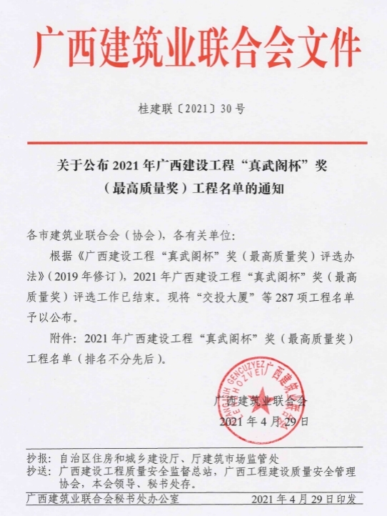 近日,廣西建筑業(yè)聯(lián)合會公布了2021年廣西建設工程“真武閣杯”獎(最高質(zhì)量獎)入選工程名單,由我公司負責監(jiān)理的8個項目脫穎而出,同時獲獎!再一次有力印證了公司在工程咨詢行業(yè)的強大實力。