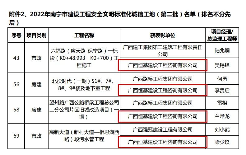 ▲2022年南寧市建設(shè)工程安全文明標(biāo)準(zhǔn)化誠信工地(第二批)獲獎名單
