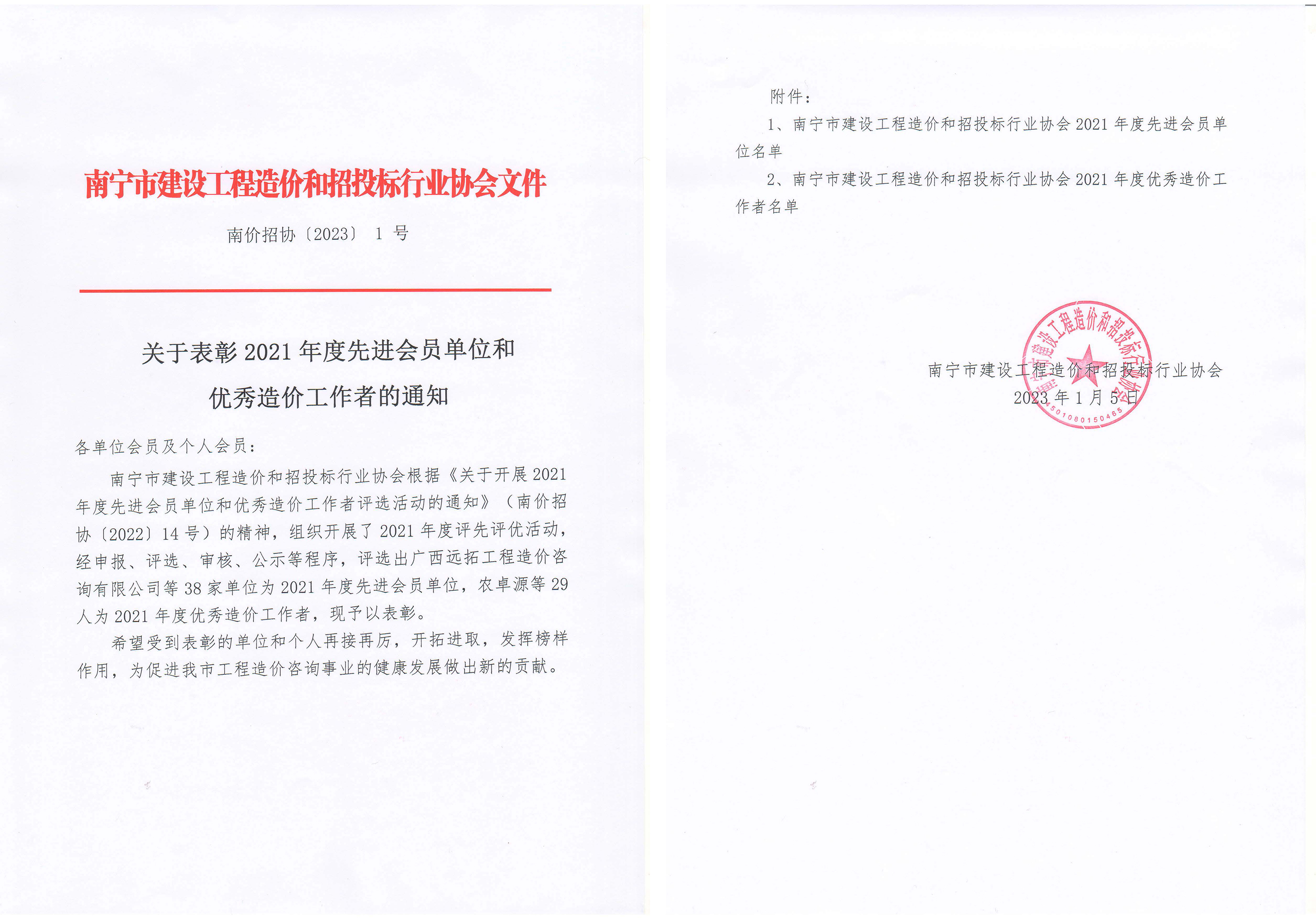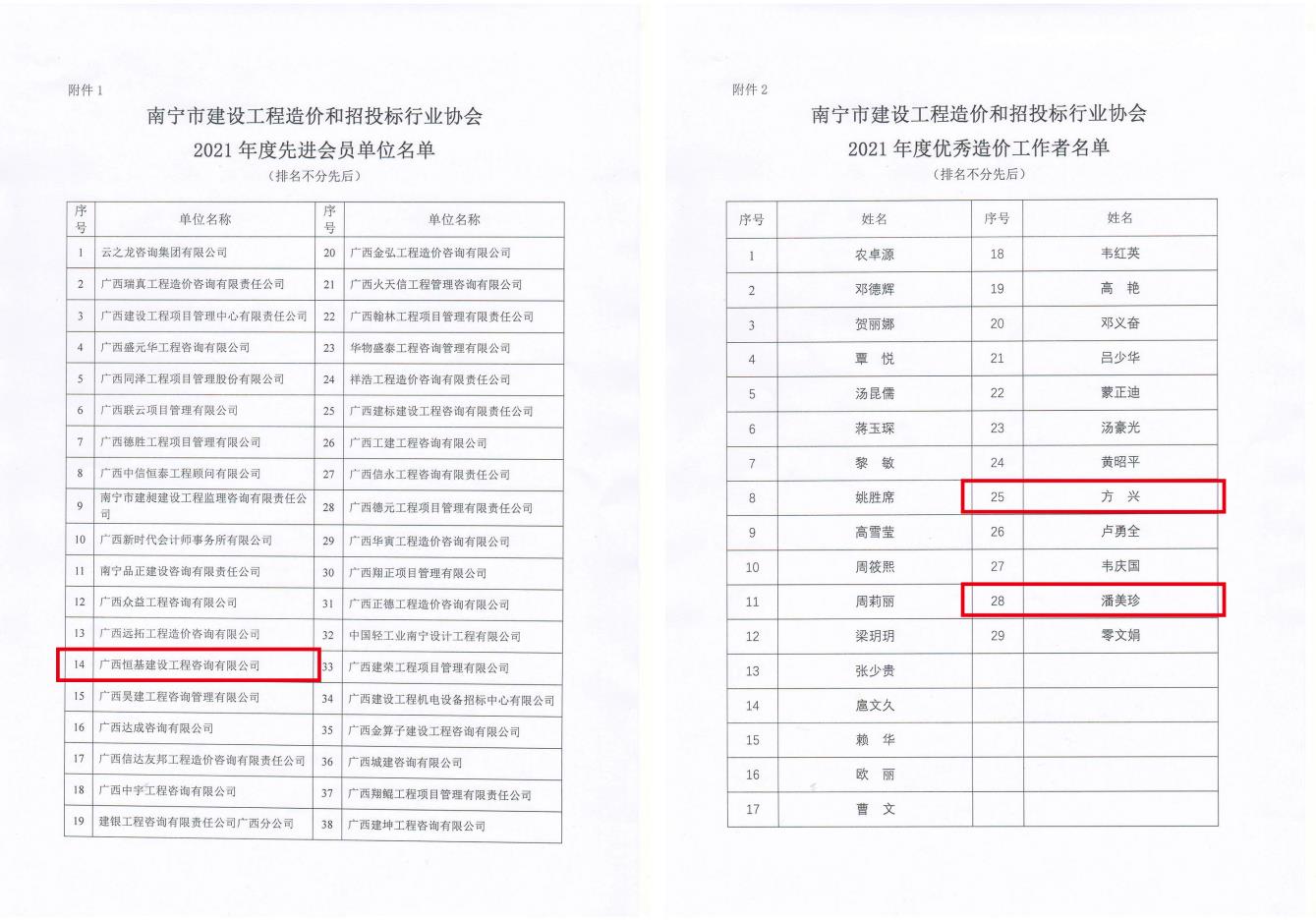 2023年1月5日,南寧市建設工程造價和招投標行業(yè)協(xié)會公布了2021年度先進會員單位和優(yōu)秀造價工作者名單,廣西恒基建設工程咨詢有限公司憑借在造價咨詢領域較高的綜合實力,榮獲“2021年度先進會員單位”榮譽稱號,公司方興、潘美珍兩位同志獲評協(xié)會“2021年度優(yōu)秀造價工作者”。
