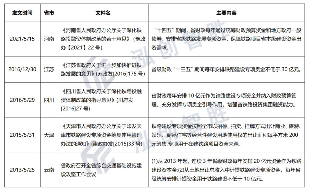 (2)鐵路建設(shè)專項(xiàng)資金,為了加快本省鐵路發(fā)展,部分省市出臺相關(guān)文件,明確安排鐵路建設(shè)專項(xiàng)資金。綜合部分省份的鐵路建設(shè)專項(xiàng)資金安排來看,一般是在土地出讓收入中提取一定比例專項(xiàng)用于省內(nèi)鐵路建設(shè)。