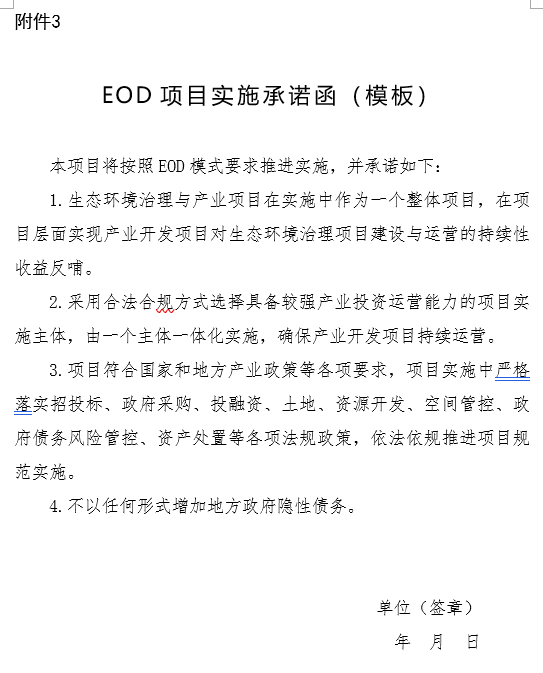 (四)EOD項目應一并提交EOD項目實施方案(編制大綱見附件2)與承諾函(模板見附件3)。承諾函由項目申報主體和實施主體(市級及以下人民政府或園區(qū)管委會)蓋章。