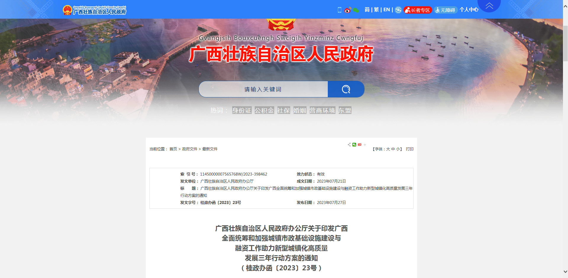 《廣西全面統(tǒng)籌和加強(qiáng)城鎮(zhèn)市政基礎(chǔ)設(shè)施建設(shè)與融資工作助力新型城鎮(zhèn)化高質(zhì)量發(fā)展三年行動(dòng)方案》已經(jīng)自治區(qū)人民政府同意,現(xiàn)印發(fā)給你們,請(qǐng)認(rèn)真組織實(shí)施。